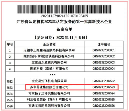 近日,全國(guó)高新技術(shù)企業(yè)認(rèn)定管理工作領(lǐng)導(dǎo)小組辦公室發(fā)布《對(duì)江蘇省認(rèn)定機(jī)構(gòu)2023年認(rèn)定報(bào)備的第一批高新技術(shù)企業(yè)進(jìn)行備案的公告》,蘇中藥業(yè)集團(tuán)股份有限公司(以下簡(jiǎn)稱“蘇中藥業(yè)”)再次榮獲國(guó)家“高新技術(shù)企業(yè)”榮譽(yù)。