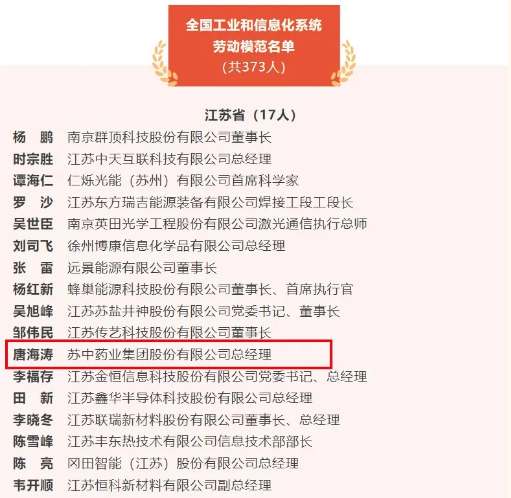 4月27日,全國工業(yè)和信息化系統(tǒng)先進(jìn)集體、勞動模范和先進(jìn)工作者評選表彰大會在北京隆重召開。蘇中藥業(yè)集團(tuán)總經(jīng)理唐海濤榮獲“全國工業(yè)和信息化系統(tǒng)勞動模范”稱號。
