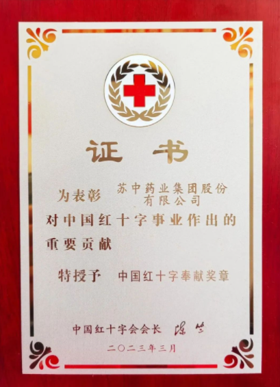 “中國紅十字奉獻(xiàn)獎?wù)隆笔侵袊t十字會總會為表彰國內(nèi)外對紅十字會人道公益事業(yè)作出重大貢獻(xiàn)的捐贈者而設(shè)置的榮譽(yù),是中國人道公益事業(yè)的最高榮譽(yù)之一。這一榮譽(yù)的獲得,不僅是對蘇中藥業(yè)在慈善事業(yè)上的杰出貢獻(xiàn)的認(rèn)可,更彰顯了公司“人道、博愛、奉獻(xiàn)”的紅十字精神和崇高的人道主義情懷。